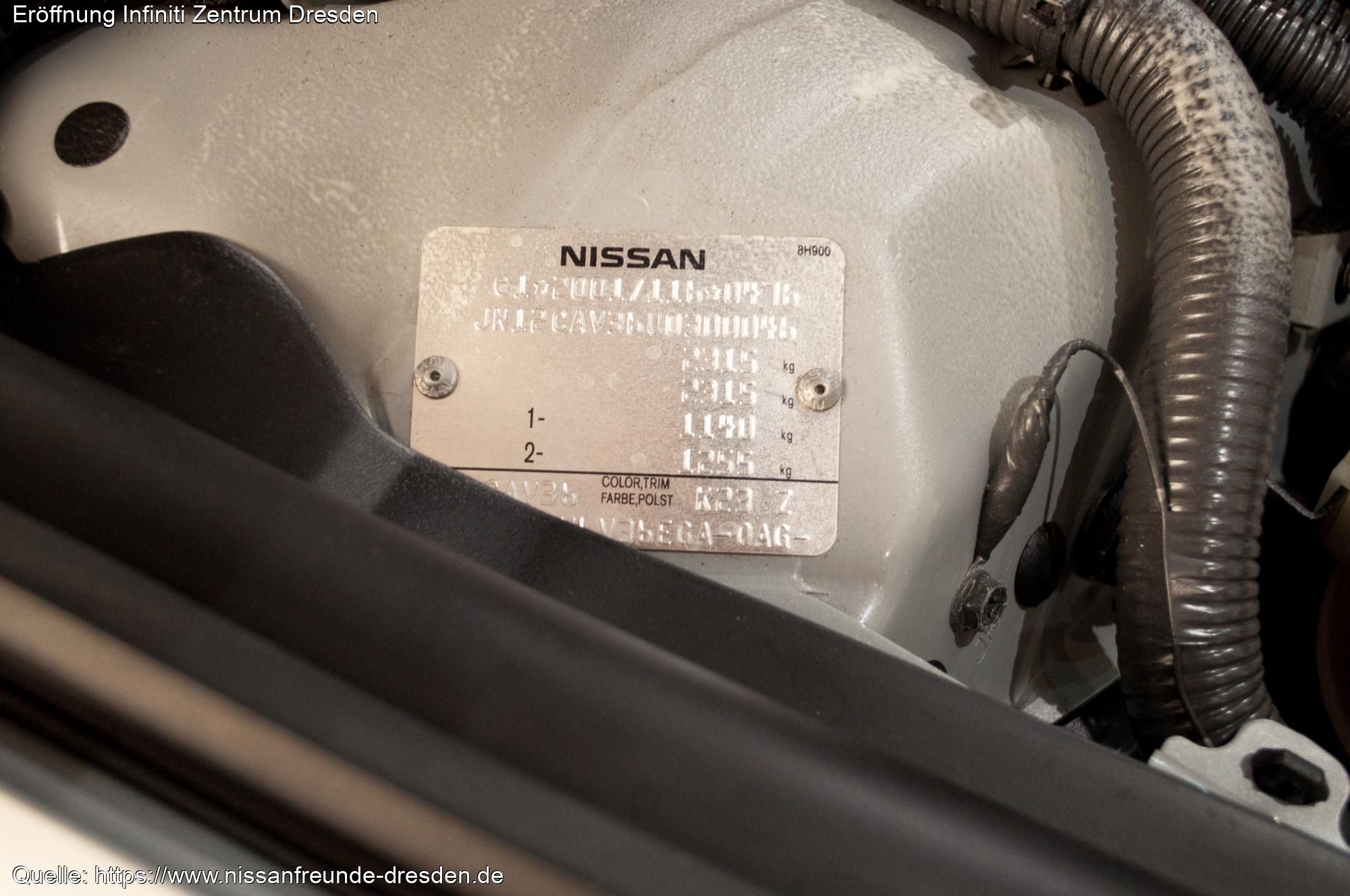 Auf dem Typenschild steht Nissan. Alle Infiniti Modelle werden in Japan hergestellt, darum fängt die Fahrgestellnummer auch mit JN an.